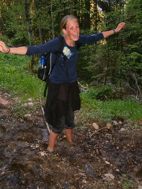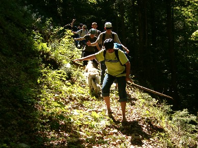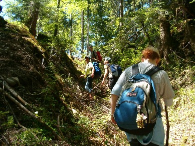 Ein wiederum kaum begangener Waldweg wartete mit Schlamm, scharfen Steinen, und Holzschlag kostete uns beinahe den letzten Nerv. Aber jetzt noch aufgeben, 4 km vor dem Tagesziel? Nein, nein, nein und nochmals nein! | |