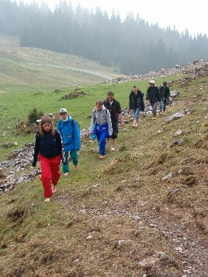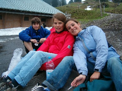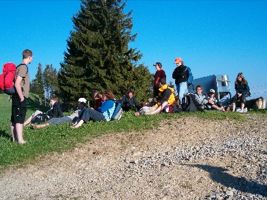 ... Holzschlag! Anschliessend folgten wir einer steilen geteerten Strasse hinunter nach Fankhaus. Erst 14 km waren geschafft und es war bereits 15 Uhr. Schmerzen, Blasen und die Aussicht auf nochmals 10 km an diesem Nachmittag war für viele zu viel. 13 Schülerinnen gaben auf, zogen die Schuhe an und marschierten direkt nach Trub. |