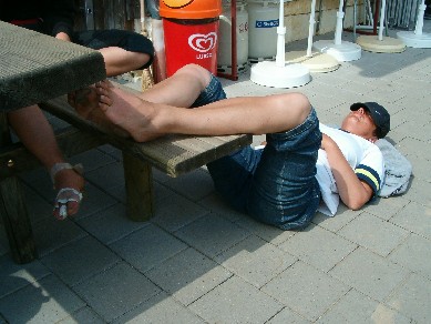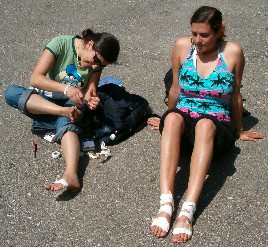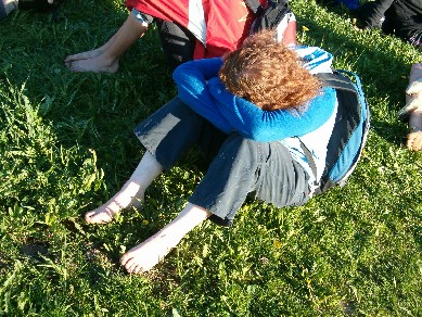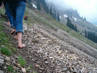 auf der Karte ganz harmlos aus, aber weit gefehlt! Vielleicht lag es daran, dass wir alle schon meinten, wir seien im Ziel. Viel wahrscheinlicher ist aber die Tatsache, dass auf diesem 2 km langen Streckenabschnitt die spitzigsten Steine der Welt liegen. Alle Barfüssler litten Höllenqualen, aber, und das ist das Wichtigste, sie gaben nicht auf! |