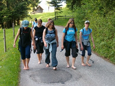 100 km barfuss Es sind dies (obiges Foto, untere Reihe von links nach rechts): Klara Lauber, Danja Müller, Daniela Mösching, Fränzi Berger, Björn Engeloch, Nicholas Champbell, Daniel Ott, Karin Walker, Christoph Affolter (Leiter), Fabienne Trummer und Matthias Saner (Leiter, nicht im Bild) |